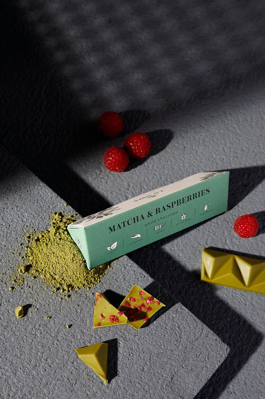 Bean-To-Bar melkchocolade reep met matcha & frambozen