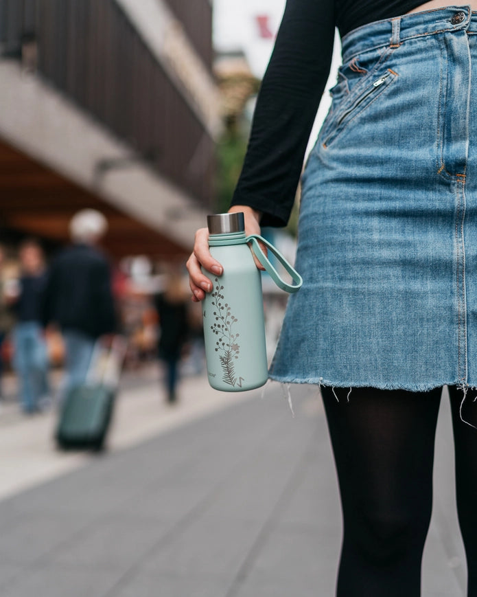 Fabriquée en acier inoxydable 18/8 de qualité alimentaire, entièrement sans BPA, phtalates ni plomb, avec un revêtement poudré pour une prise en main agréable, antidérapante et sans condensation. La bouteille est également dotée d’un fond antidérapant et d’une anse en silicone pour un transport facile.