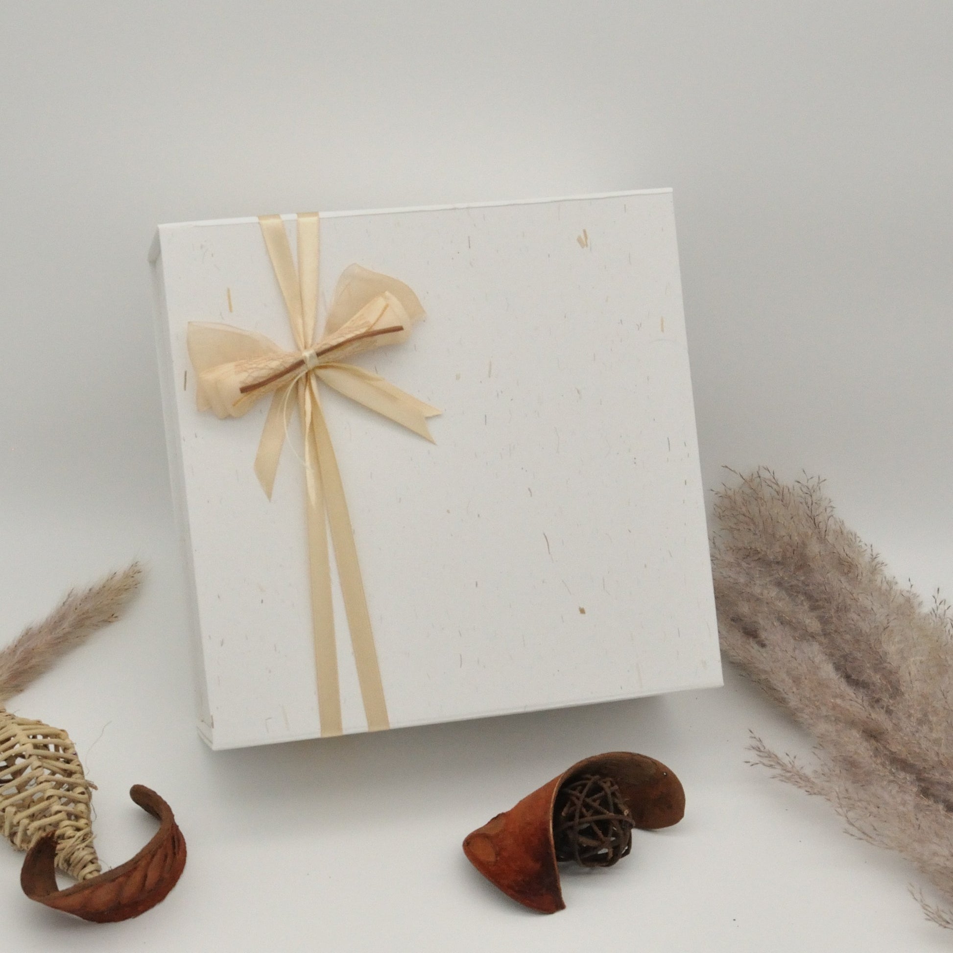 De geschenkdoos heeft een witte afwerking met stro accenten en een beige satijnen strik en bevat producten die mooi verpakt zijn in wit tissuepapier met bloemmotief. De doos, die 23 cm x 23 cm x 11 cm meet en een magnetische sluiting heeft, kan hergebruikt worden om babyherinneringen te bewaren.