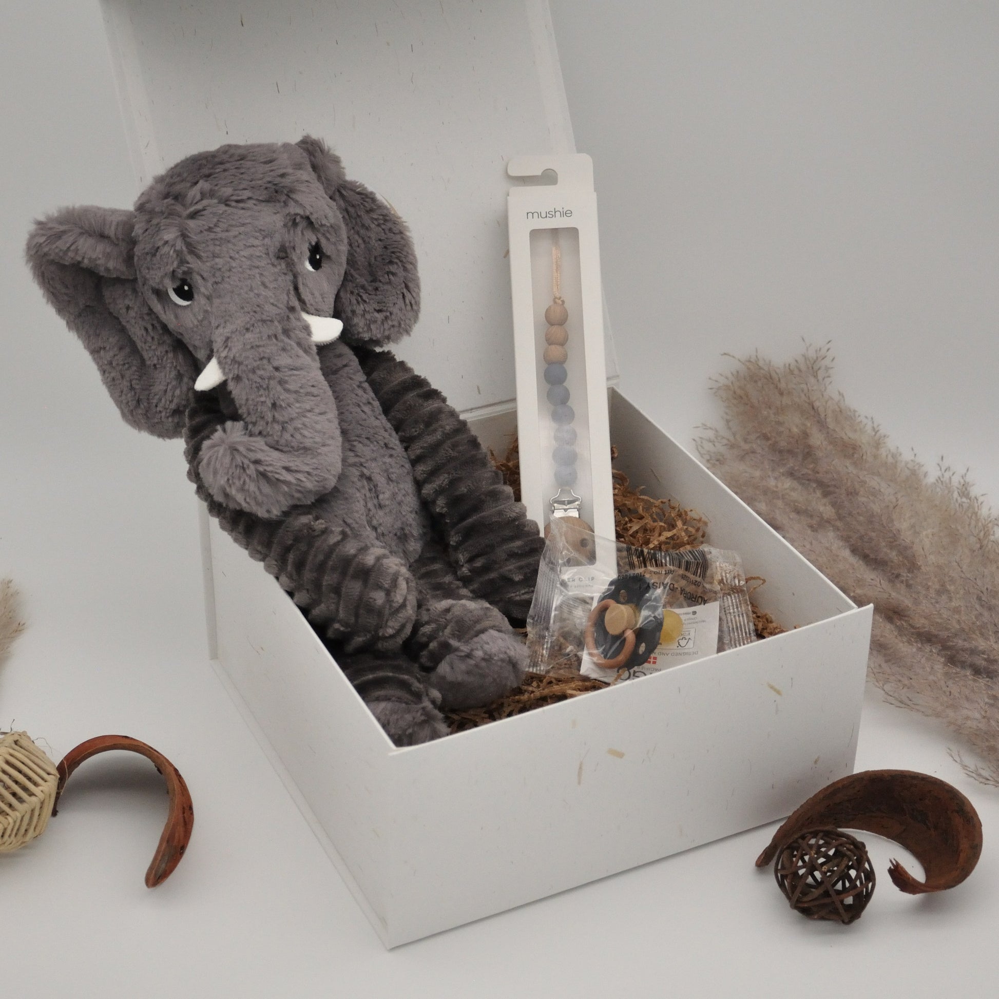 De geschenkdoos heeft een witte afwerking met stro accenten en een beige satijnen strik en bevat producten die mooi verpakt zijn in wit tissuepapier met bloemmotief. De doos, die 23 cm x 23 cm x 11 cm meet en een magnetische sluiting heeft, kan hergebruikt worden om babyherinneringen te bewaren.